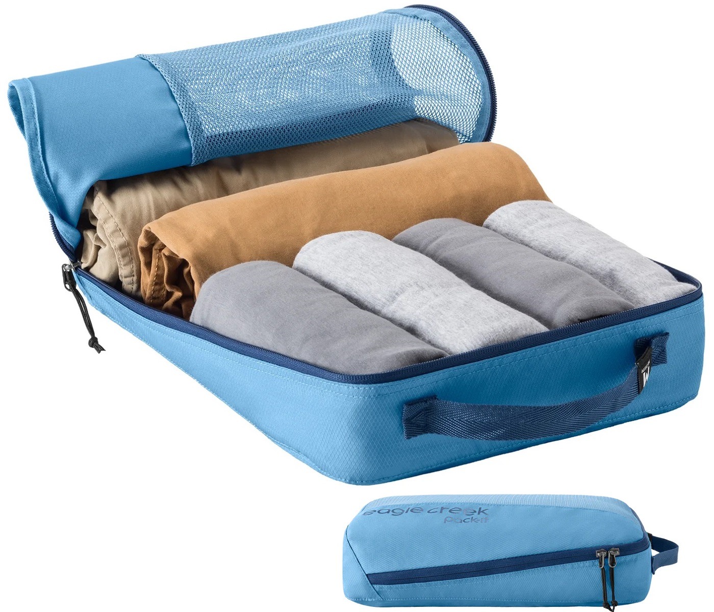 Made by Eagle Creek, the word is “ORGANIZE” and these packing cubes help you do so.  Packing, and unpacking, and finding your stuff has never been so easy!